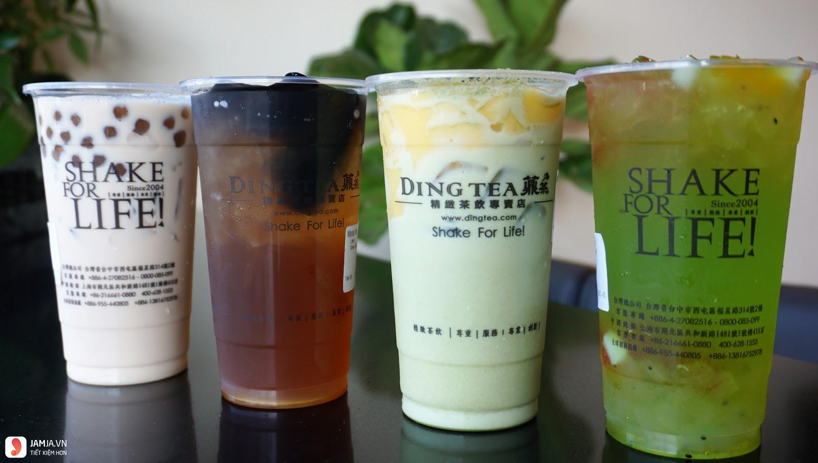 Bạn có thể tìm thấy sự phong phú trong thực đơn của Dingtea với các loại trà, trà sữa, nước hoa quả, cà phê và sữa chua được sử dụng kèm với gần mười loại trân châu, thạch và kem tươi khác nhau tùy theo khẩu vị và ý thích của mỗi người.