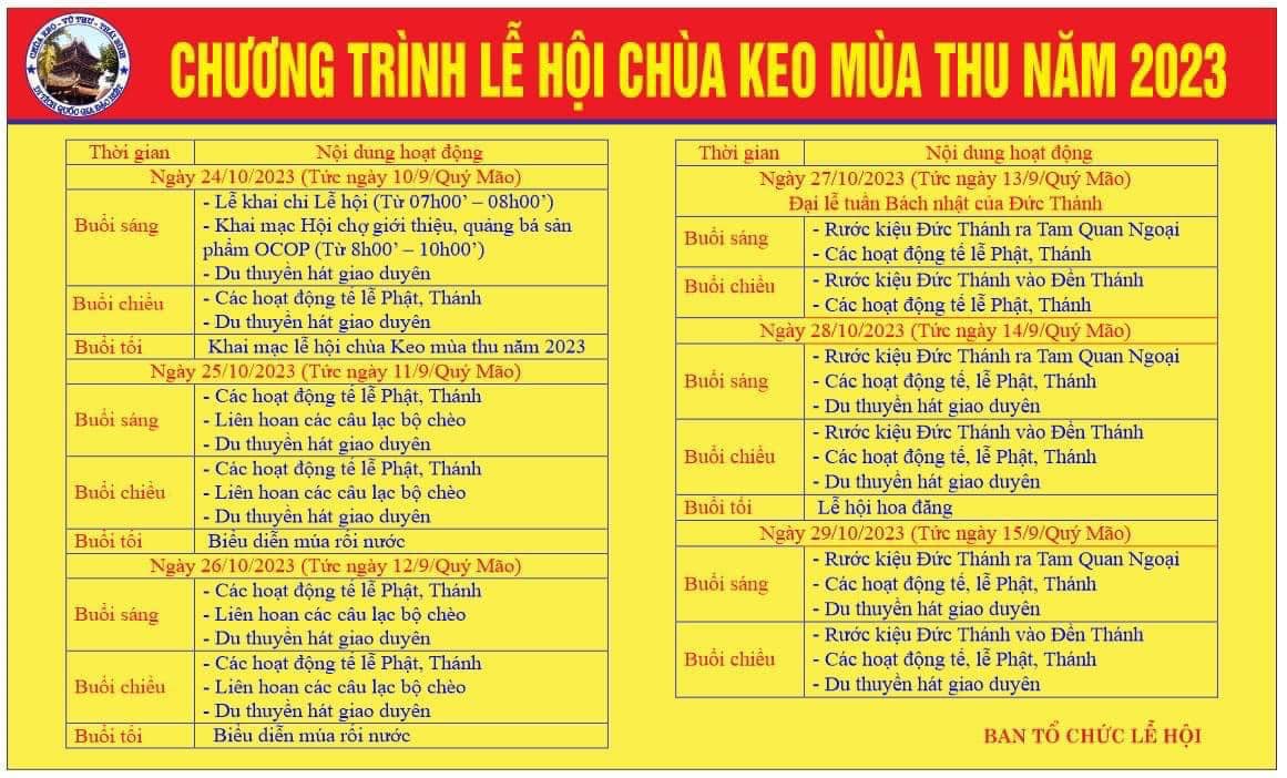 Lễ hội mùa thu năm nay được tổ chức theo quy mô cấp huyện, do Huyện ủy, HĐND, UBND huyện Vũ Thư tổ chức từ ngày 24 – 29/10/2023 (tức ngày 10 – 15/9 âm lịch). Chương trình khai mạc năm nay có điểm nhấn là chương trình nghệ thuật đặc sắc mang âm hưởng sử thi hào hùng với các huyền tích lịch sử.
