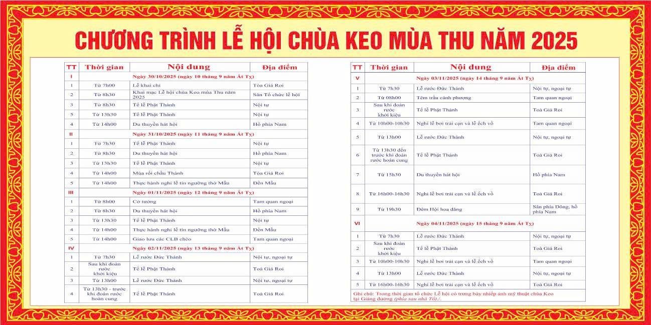 Trong các ngày diễn ra lễ hội từ 30/10 đến 4/11/2025 (tức ngày 10 - 15/9 năm Ất Tỵ), các hoạt động phần lễ được thực hiện theo đúng nghi thức cổ truyền đã được các thế hệ làng Keo đời nối đời chung tay gìn giữ. Khi tham gia lễ hội chùa Keo, du khách có cơ hội được tìm hiểu về những nghi lễ như: Lễ khai chỉ, lễ rước Đức Thánh, múa rối chầu Thánh, múa ếch vồ, chèo trải cạn chầu Thánh, đêm hội hoa đăng, thực hành nghi lễ tín ngưỡng thờ Mẫu và hoạt động tế lễ của các đoàn tế, nhân dân, tín đồ Phật tử...