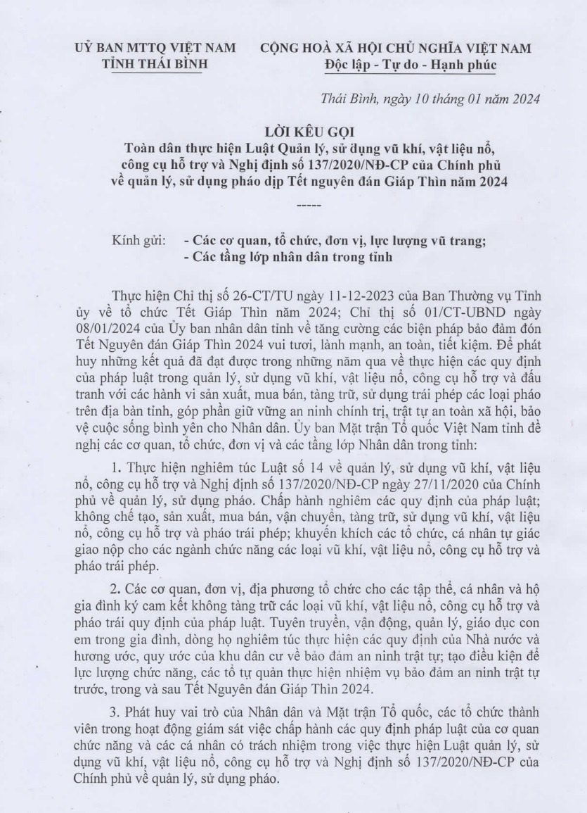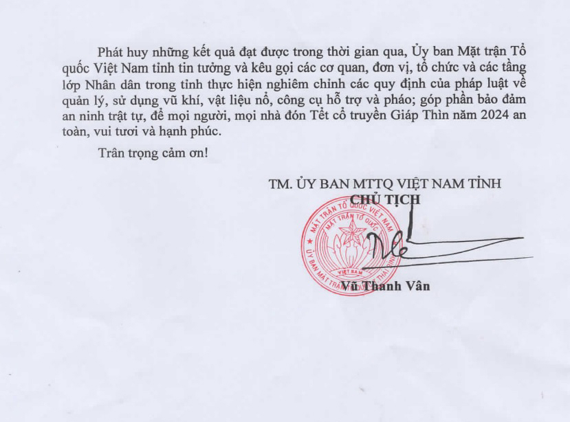 Uỷ ban MTTQ Việt Nam tỉnh tin tưởng và kêu gọi các cơ quan, đơn vị, tổ chức và các tầng lớp Nhân dân trong tỉnh thực hiện nghiêm chỉnh các quy định của pháp luật về quản lý, sử dụng vũ khí, vật liệu nổ, công cụ hỗ trợ và pháo; góp phần bảo đảm an ninh trật tự, để mọi người, mọi nhà đón Tết cổ truyền Giáp Thìn năm 2024 an toàn, vui tươi và hạnh phúc.