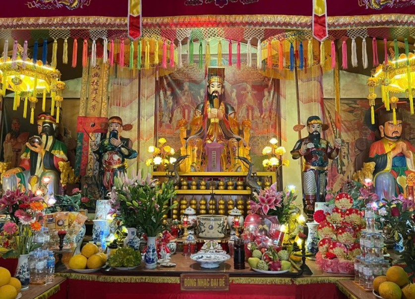 Phía trước khu đền chính, khu vực sân ngoài, là nơi đặt tượng thờ Thần Nông Viêm Đế tạo hình bằng đá tự nhiên vô cùng quý giá. Bên trong đền chính gồm ba cung. Cung ngoài thờ Đức Thánh Trần cùng các danh tướng ở giữa, bên trái là Chúa Sơn Trang và Võ Tài Thần Trưởng Quản Ngũ Lộ Thần Tài, bên phải là Văn Xương Đế Quân và Quan Hoàng. Cung trong cùng thờ Ngọc Hoàng Đại Đế, Nam Tào, Bắc Đẩu, Thái Bạch Kim Tinh, Thái Âm Tinh Quân, Thái Dương Tinh Quân.