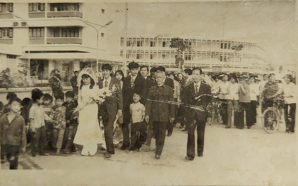 Hình ảnh một đám cưới trên đường phố thị xã Thái Bình năm 1980, phía sau là tòa nhà khách sạn Giao tế 5 tầng cao nhất tỉnh ngày đó (ảnh sưu tập có bản quyền)