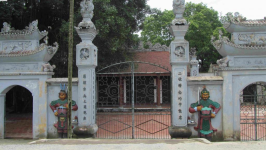 Ngôi đền nằm ngoài đê sông Hồng giữa một không gian thoáng đãng. Đền có kiến trúc tổng thể theo kiểu chữ Đinh bao gồm: Tiền tế 5 gian, hậu cung 5 gian liên kết bộ vì theo kiểu chồng rường, mái lợp ngói mũi hài. Tại toà tiền tế đặt một cỗ ngai lớn chạm khắc hình rồng, hoa lá cách điệu, các nét chạm mang phong cách nghệ thuật thế kỷ 19. Dưới ngai thờ thần là tượng 2 tuỳ tướng được tạo tác khá đẹp và phóng khoáng.