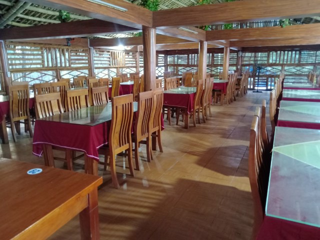 ân của Nhà hàng, tại đây Du khách có thể nghỉ ngơi, uống trà dưới tán cây Phi lao xanh mát. 2 cổng phụ 2 bên dẫn thẳng vào Nhà hàng Lá Cọ A1 và A2 với diện tích rộng rãi, sang trọng. Với thiết kế phong khách Nhà sàn độc đáo, vừa hiện đại vừa dân giã kết hợp hệ thống âm thanh, sân khấu và bar mini ch