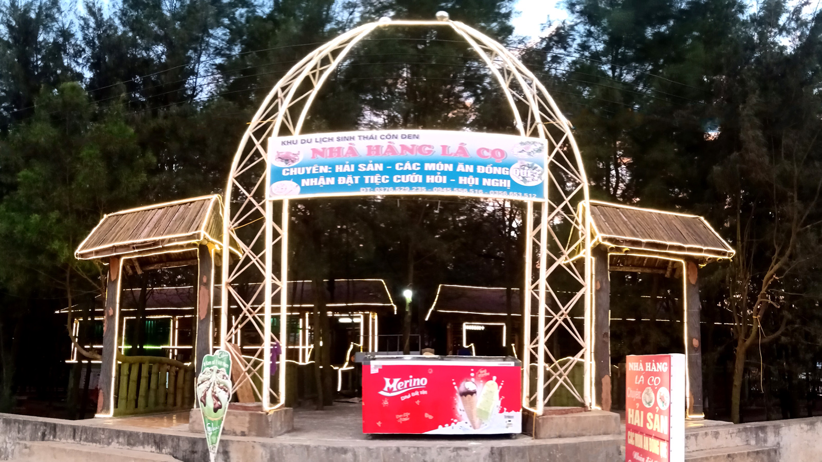 NHÀ HÀNG LÁ CỌ Trong danh sách ẩm thực của Cồn Đen, Nhà hàng Lá Cọ luôn là điểm đến yêu thích và không thể bỏ qua của khách hàng, Khách du lịch khi đặt chân đến Cồn Đen. Nhà hàng Lá Cọ được thiết kế theo phong cách nhà vườn, dân giã với thiết kế cổng vào tam quan truyền thống. Cổng chính dẫn vào s
